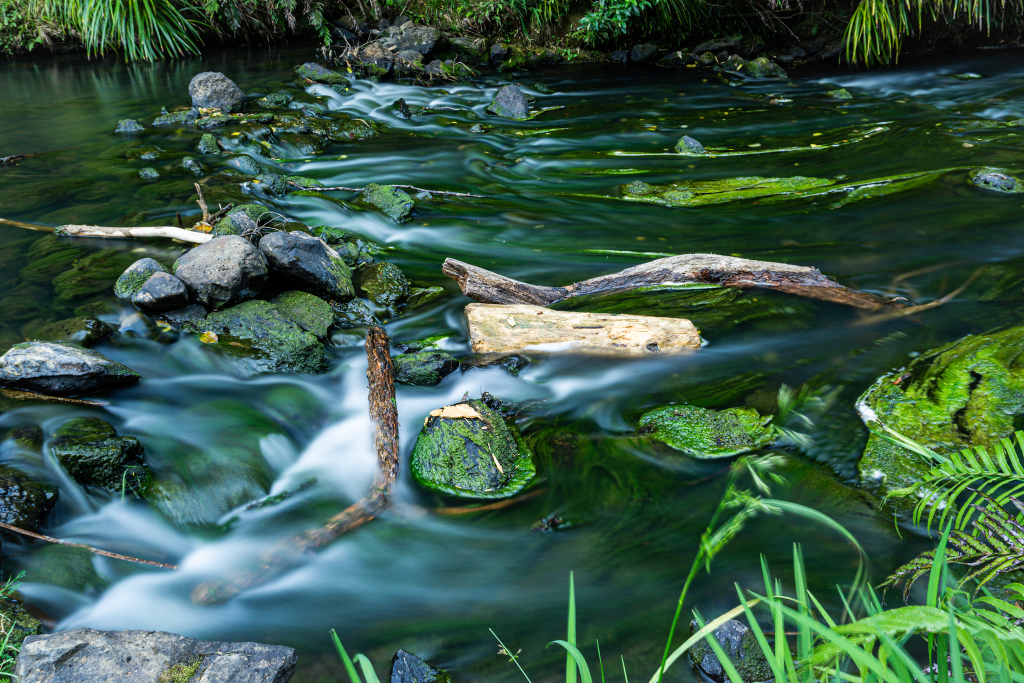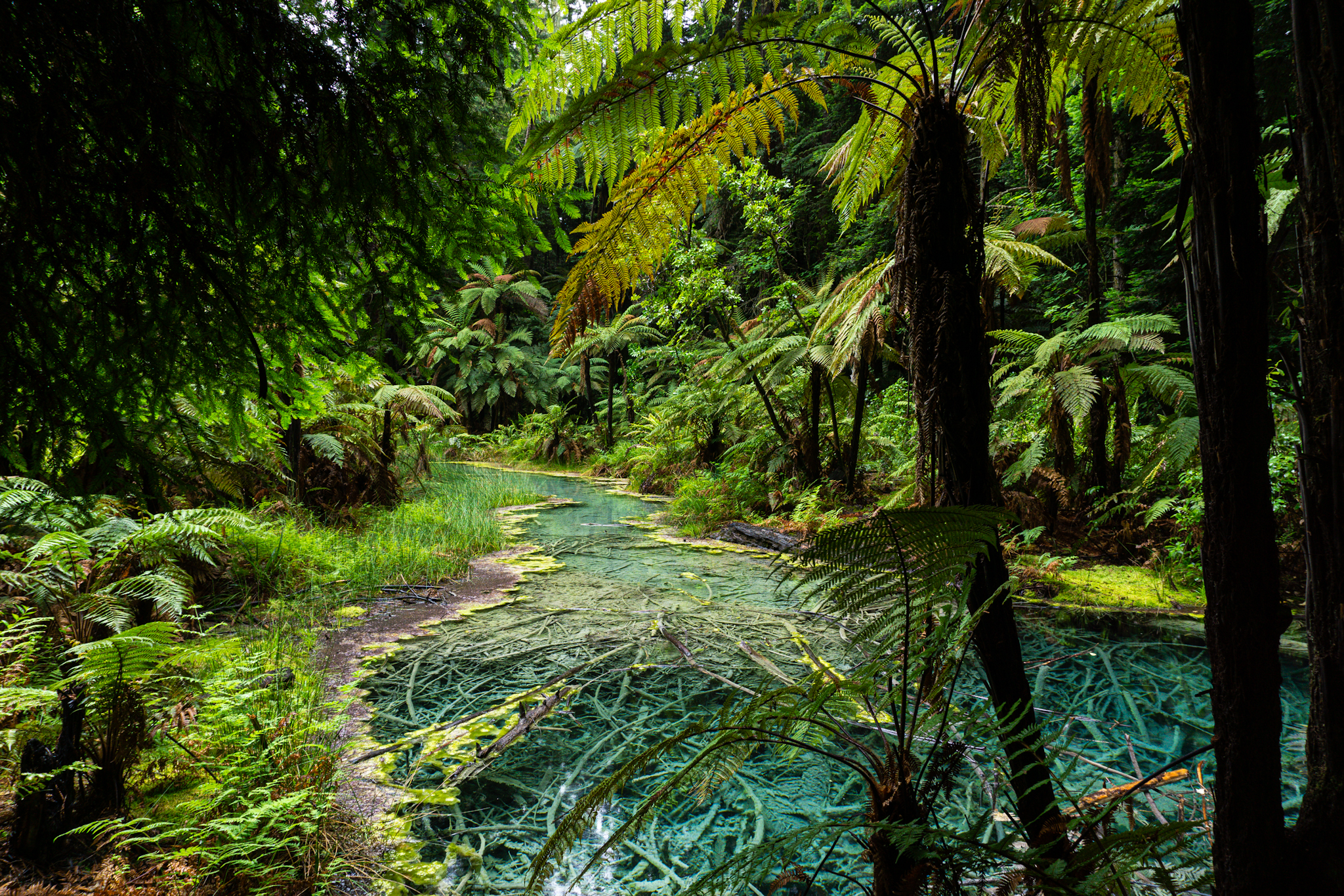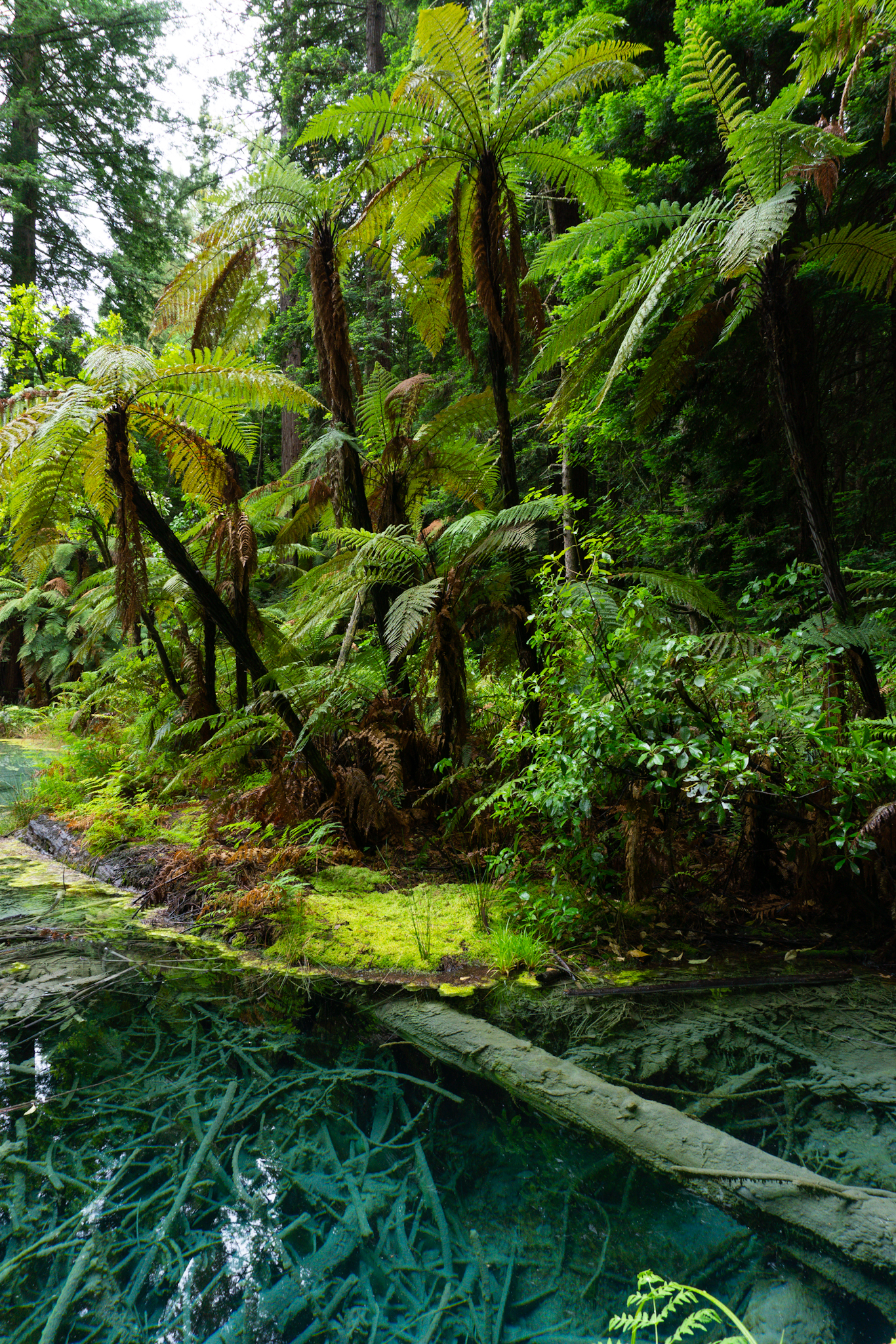 Redwood – kalifornischer MammutbaumFluss im Redwoods Forest: die Äste und Blätter im Waser sahen aus, wie vereist. Wahrscheinlich wieder durch die Gase im Wasser.Silberfarn – Neuseelands NationalsymbolAlles ist einfach so grün!