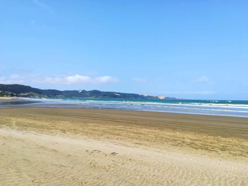 Auf unserer Fahrt zum Cape Reinga (Josi ist gefahren ?) ging es ordentlich bergauf und bergab. Links und rechts die typischen grünen Wiesenhügel, die einem bei dem Gedanken an Neuseeland so in den Kopf kommen und einem immer wiederkehrenden Wechsel der Flora. Ganz oben, am nördlichsten Punkt der Insel angekommen, bließ uns ordentlich der Wind um die Ohren. Dazu kam, dass es nur 2 Campingplätze mit relativ unbefestigten Zufahrten gab, weswegen wir uns trotz der langen Fahrt entschieden, noch mal 125 km südlich zum Ninety Mile Beach zu fahren. Dort haben wir dann abends noch versucht die Milchstraße einzufangen aber leider war es zu sehr bewölkt.